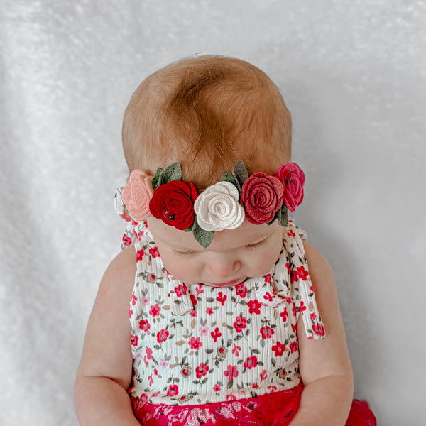 5 Rosettes in various reds & pinks. Colors may vary. About 5 inches across.